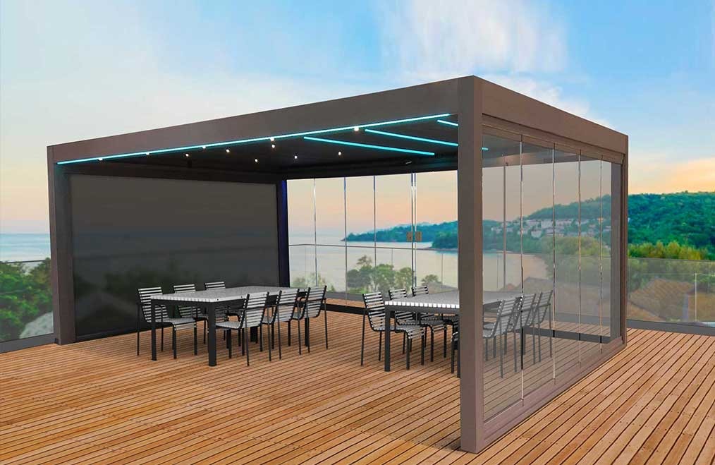- Las cortinas de cristal son ideales para cerrar pérgolas bioclimáticas, creando espacios habitables durante todo el año.
